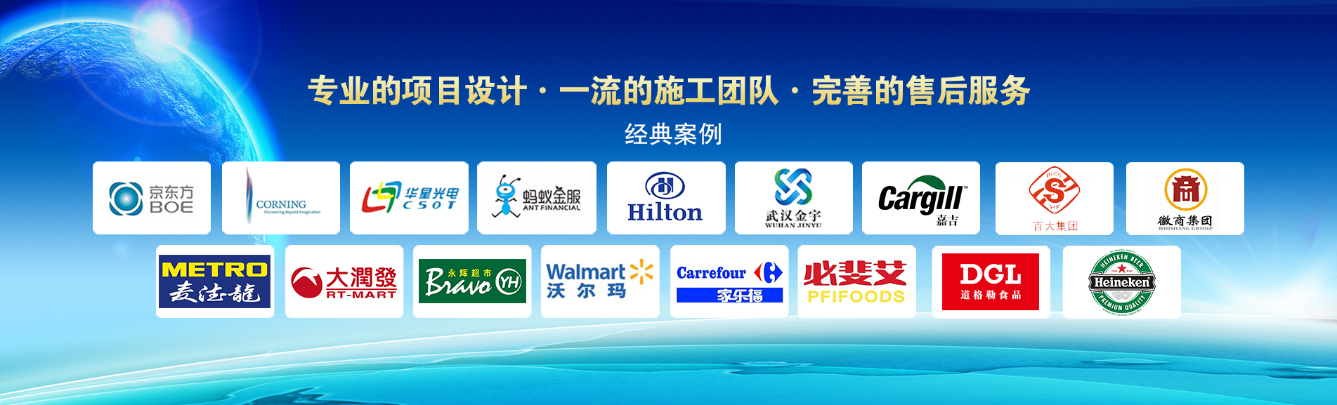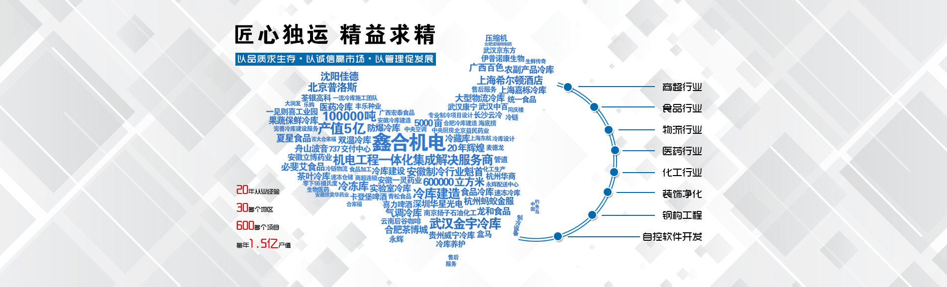 冷凍冷藏設(shè)備大型冷庫項(xiàng)目:   武漢中百物流冷庫(40000㎡)、蘇州、北京普洛斯大型物流庫(17000㎡)、沈陽佳德物流冷庫(20000㎡)、上海東航配餐物流庫(6000㎡)、杭州華商勾莊物流冷庫(24000㎡)、安徽安心蔬菜綠色食品冷庫(12000㎡)、武漢金宇冷庫(35000㎡)、必斐艾食品廠(14000㎡)、中國-東盟(百色)農(nóng)產(chǎn)品交易中心冷庫物流工程(30000㎡)、遵鐵物流冷鏈物流區(qū)建設(shè)項(xiàng)目中心冷庫物流工程(16500㎡)、長沙云冷產(chǎn)業(yè)園冷庫物流工程(21000㎡)等;大型中央空調(diào)項(xiàng)目:   武漢康寧顯示玻璃廠廠房、武漢京東方模組廠房、武漢華星光電模組廠房、深圳華星光電模組廠房,杭州阿里巴巴辦公樓,舟山波音737機(jī)場辦公樓,南京江北能源站、上海金融大酒店等